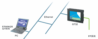 GT32T1的乙太網路功能可實現與遠端的PLC FP系列產品的相互通訊(包含程式編緝,監控)。此外,GT存儲編緝功能(GTWIN產品中的附帶功能)可把警報歷史記錄,曲線圖信息儲存成檔案。