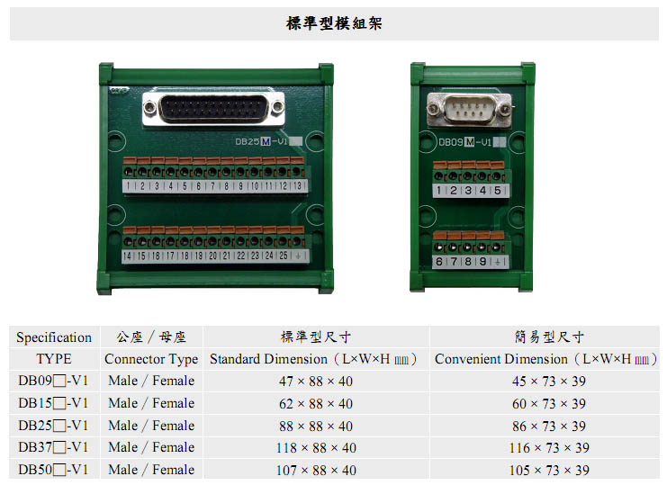 接線轉接模組系列可使用在TS15、TS32及TS35三種軌道,另有簡易型模組架可使用在TS35軌道。接線模組系列是使用在線與螺絲端子台之間的連接功能。接線模組系列採用免螺絲端子台有易拔插的方便性。圓棒端子及單芯線能直接插入,不需手把的輔助。退線時只要以一隻起子壓下即可輕易將電線取出。D型連接器提供9、15、25、37、50等不同腳位可供選擇。